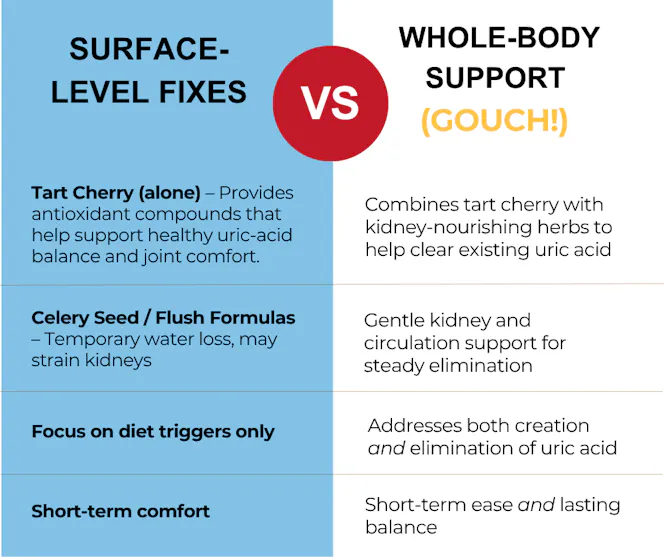 1️⃣ Excess uric-acid formation — Tart cherry and quercetin support normal purine metabolism.